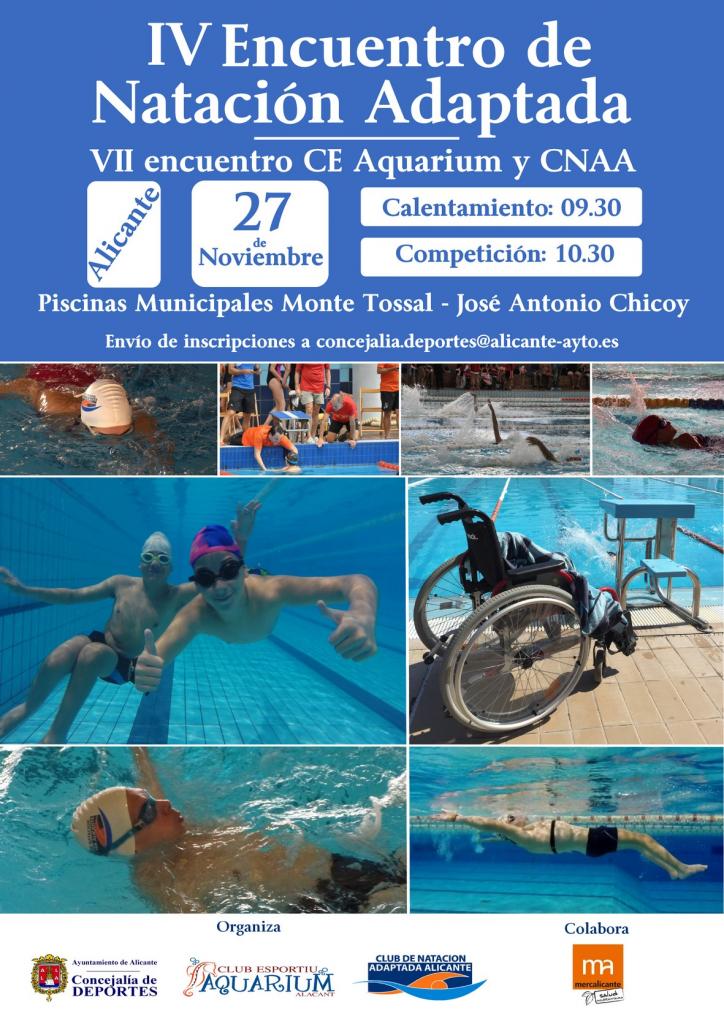 El domingo 27 de noviembre, se celebrará en las Piscinas Municipales Monte Tossal-José Antonio Chicoy el "IV Encuentro de Natación Adaptada Alicante y VII Encuentro Aquarium y Club Natación Adaptada Alicante".