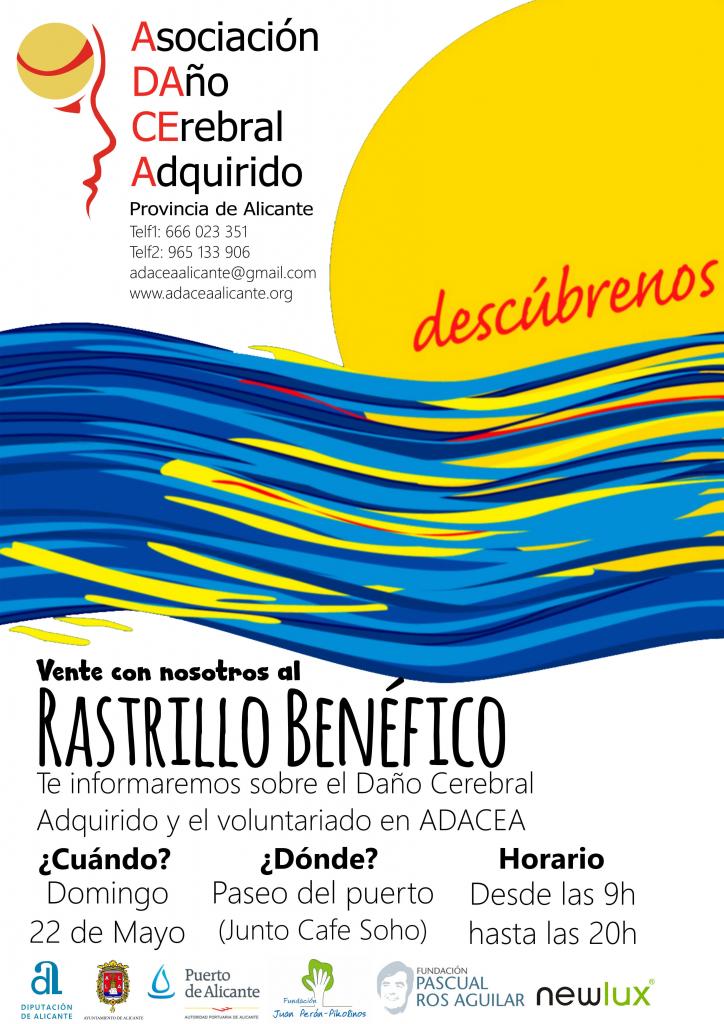 ADACEA (Asociación Daño Cerebral Adquirido Provincia de Alicante) celebra su tradicional RASTRILLO BENÉFICO. Se trata de una Jornada Lúdico Festiva en la que se informa sobre daño cerebral adquirido y ADACEA y en la que todos los beneficios obtenidos van destinados al mantenimiento de los servicios que ofrece la asociación. Además, contarán con actividades infantiles de 11:00 a 14:00 horas