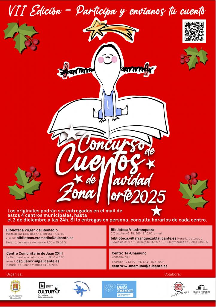 La Concejalía de Cultura del Ayuntamiento de Alicante en colaboración con las Concejalías de Educación, Juventud, Bienestar Social y Planes Estratégicos, dentro del Plan Integral Barrios Zona Norte, organiza el VII Concurso de Cuentos de Navidad con el objetivo de fomentar la creatividad artística y literaria de niños, jóvenes y adultos residentes en la Zona Norte.