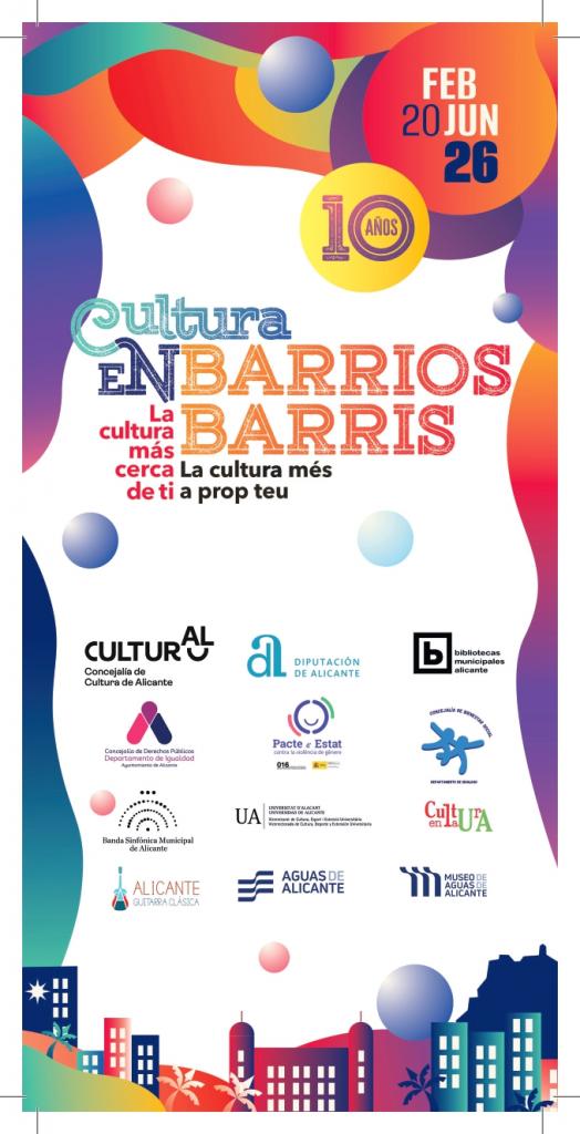 Este año el programa celebra su 10º aniversario, consolidándose como una iniciativa cultural de referencia en los barrios de la ciudad, con un modelo descentralizado, participativo e inclusivo que acerca la cultura a la ciudadanía, en su entorno más cercano. Durante una década, el programa ha contribuido a dinamizar los espacios comunitarios, fomentar la creación local y fortalecer el tejido cultural y social de Alicante.