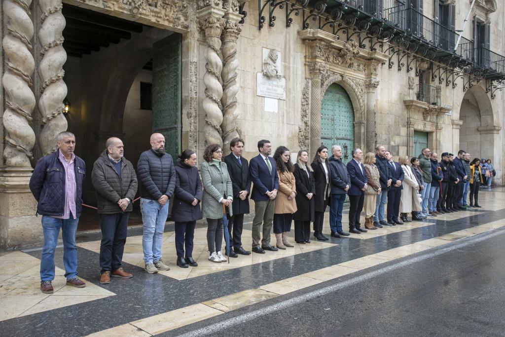 Alicante, 12 de marzo de 2023. El alcalde de Alicante, Luis Barcala, y la corporación municipal alicantina han guardado un minuto de silencio a las 12 del mediodía a las puertas del Ayuntamiento en conmemoracion del Día Europeo de las Víctimas del Terrorismo, una cita que se produce al cumplirse 22 años de los terribles atentados de Madrid un 11M del año 2004, que dejaron 193 muertos y más de 2.000 heridos. Alicante secunda de esta forma esta convocatoria de la Federación Española de Municipios y Provincias, FEMP, dirigida a los ayuntamientos, diputaciones, cabildos y consells de toda España.