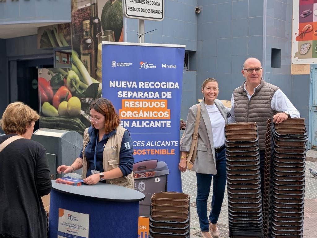 Alicante, 21 de octubre de 2024. El Ayuntamiento de Alicante y Netial, empresa concesionaria del servicio de limpieza viaria y recogida de residuos, han comenzado a instalar en los mercadillos de la ciudad un nuevo sistema de recogida selectiva de residuos, empezando por Benalúa y Carolinas. Se han dispuesto un total de 35 dispositivos transportables o móviles, 22 para depositar cartón y 13 para envases, además de soportes para los restos orgánicos con bolsas marrones y gris para el resto de residuos.