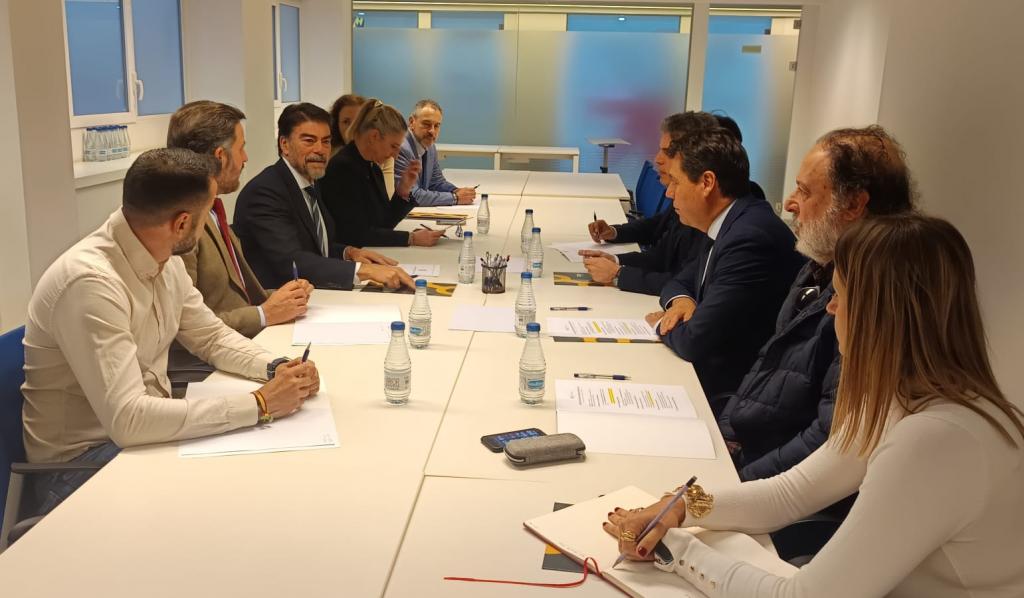 Alicante, 2 de diciembre de 2025. Los alcaldes de Alicante y Elche, Luis Barcala y Pablo Ruz, se han reunido este lunes con la nueva junta directiva de la Confederación Empresarial de la Comunidad Valenciana (CEV) en Alicante que preside César Quintanilla. En esta primera toma de contacto, los máximos responsables de los dos ayuntamientos y de la organización empresarial han acordado “ir de la mano” para seguir reclamando infraestructuras relacionadas con el agua, el transporte, la movilidad y todas aquellas que beneficien al interés general de las dos ciudades y del conjunto de la provincia.