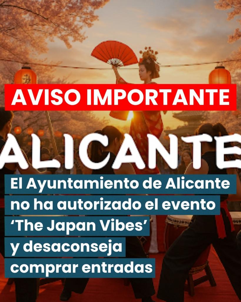 El Excmo. Ayuntamiento de Alicante ha advertido de que no se ha concedido ningún tipo de autorización al supuesto evento ‘The Japan Vibes’ que se anuncia para los días 15, 16 y 17 de mayo de 2026 en Alicante, y ha recomendado no comprar entradas para este evento dado que podría tratarse de un fraude.