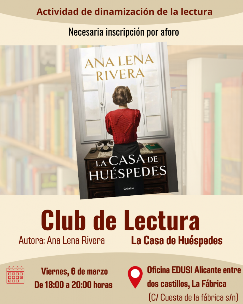La próxima sesión tendrá lugar el viernes 6 de Marzo, de 18:00 a 20:00 h, con una tertulia literaria en torno a la obra "La casa de huéspedes", de la autora Ana Lena Rivera.