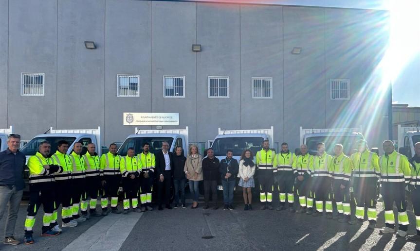 Alicante, 19 de febrero de 2026. La contrata para el mantenimiento de aceras, plazas y espacios públicos ha incorporado siete vehículos eléctricos equipados con el material necesario para trabajar de forma simultánea en distintas zonas de la ciudad. La concejala de Infraestructuras, Cristina García, y responsables de la empresa Acsa Infraestructuras han presentado este jueves el nuevo equipamiento en las instalaciones de la concejalía junto con los trabajadores de las brigadas.