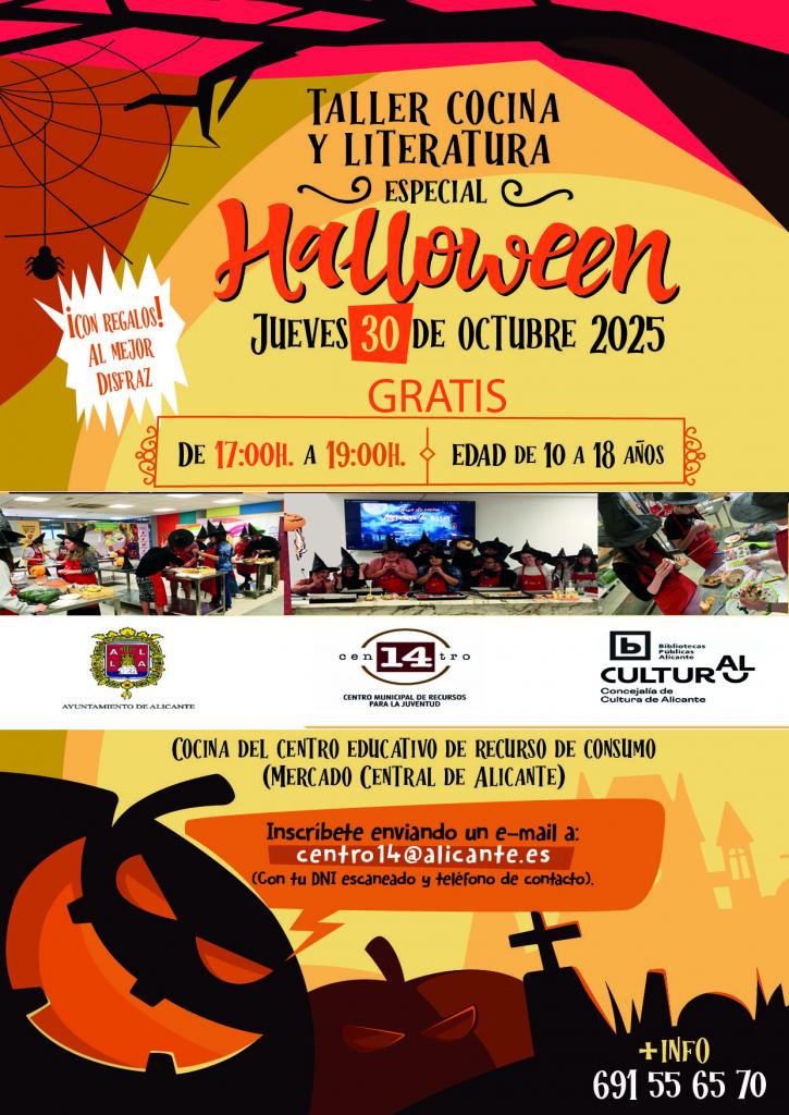 Gracias a Bibliotecas Públicas Municipales de Alicante que han elaborado una guía de "Literatura de Terror" para todas las edades, que os recomendaremos y enseñaremos en este taller especial “Cocina Halloween”. La cocina está llena de aromas y sabores muy especiales y en ocasiones con aspectos terroríficos. Realizaremos recetas incluyendo la experimentación para la creación de nuevos sabores y dar un espectáculo visual algo terrorífico a nuestros platos.