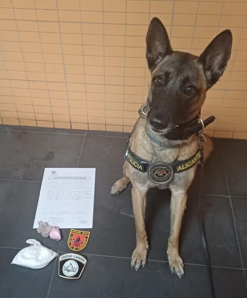 Alicante, 10 de abril de 2026. La unidad canina de la Policía Local de Alicante ha intervenido unos 210 gramos de cocaína y otras sustancias estupefacientes en dos operaciones llevadas a cabo los pasados miércoles y jueves en la estación de autobuses, en las que ha intervenido la perra 'Kata', especializada en la detección de droga, y en las que fueron detenidos dos hombres a bordo de sendos autocares que cubren la línea entre Almería y Barcelona.
