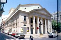 Edificio de estilo neoclásico levantado, según proyecto del arquitecto E. Jover Pierrón, entre 1846 y 1848. Aunque el diseño original concebía el edificio exento, ocupando el centro de una plaza, finalmente se construyó manteniendo dos de las cuatro alineaciones de las calles. Realizado en piedra arenisca trabajada en sillares, su planta es rectangular. Frente a la concepción de las fachadas laterales y trasera plenamente integradas en el entorno urbano, la principal, de gran monumentalidad, se resuelve con pórtico sostenido por seis columnas de orden dórico con basas sin pedestal, fustes lisos y friso dividido en triglifos y metopas. El frontón triangular, carente de decoración, presenta igual inclinación de pendientes que la cubierta. Su cornisa enlaza con la que recorre todo el edificio, si bien su perfil es diferente. El interior, típico teatro a la italiana, posee tres zonas claramente diferenciadas: el vestíbulo, la cavea con planta en forma de herradura y el escenario.